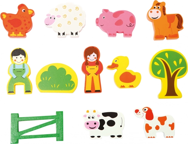 Odkrijte čar kmetije v praktični embalaži. Potovalni kovček se po razgrnitvi spremeni v pregledno igralno ploščo, na kateri bodo otroci oživili zgodbe z 12 lesenimi figuricami kmetijskih živali. Zaradi masivnega lesa so figurice trpežne, prijetne na otip in k raziskovanju vabijo s pisanimi barvami.