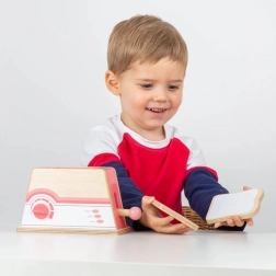 Toaster je izdelan iz trpežnega lesa z zaobljenimi robovi za varno igro. Primeren za vsako otroško kuhinjico.