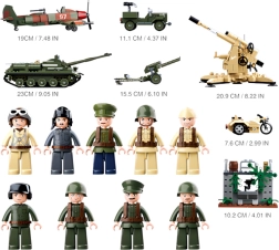 Sestavite tank, terensko vozilo, letalo, motor in topniške kose. Realistične podrobnosti in premični deli omogočajo ustvarjanje napetih bojnih scenarijev.