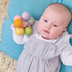 Pastelne lesene kroglice na elastični gumici lepo sedejo v roko in pomagajo olajšati občutljive dlesni med izraščanjem zobkov.