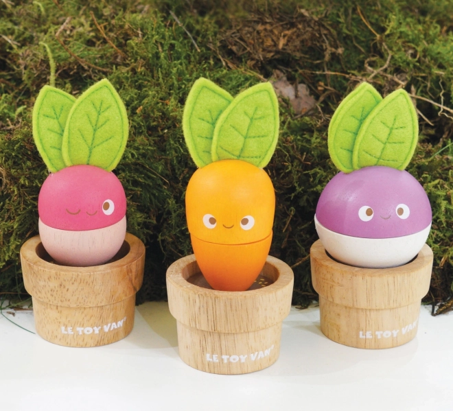Prisrčen komplet lesenih lončkov za rože z zelenjavo znamke LE TOY VAN spodbuja fino motoriko, koordinacijo oko–roka in domišljijo. Otroci lahko mešajo in sestavljajo posamezne dele v korenček, redkvico in peso ali ustvarjajo lastne kombinacije. Igrača je izdelana iz trajnostnega lesa, ima volnene (filc) listke in je ročno dodelana z netoksičnimi barvami na vodni osnovi.