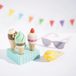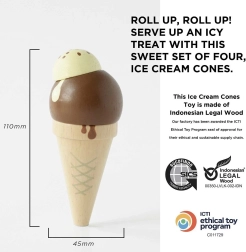 Igra s sladoledi naravno razvija kreativnost, socialne veščine in komunikacijo. Trdna konstrukcija iz trajnostnega lesa in etična proizvodnja zagotavljata vzdržljivost tudi pri vsakodnevni uporabi. Zahvaljujoč realističnim podrobnostim otroke vabi k postrežbi, štetju porcij in izmišljanju lastnih okusov.