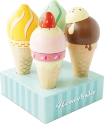 Komplet lesenih sladoledov HONEYBAKE znamke Le Toy Van spremeni vsako otroško sobo v mali sladoledni kotiček. Štiri različno okrašene kepice na naravnih kornetih so ročno poslikane z ekološkimi barvami na vodni osnovi in postavljene na stilsko stojalo za pregledno razstavljanje.