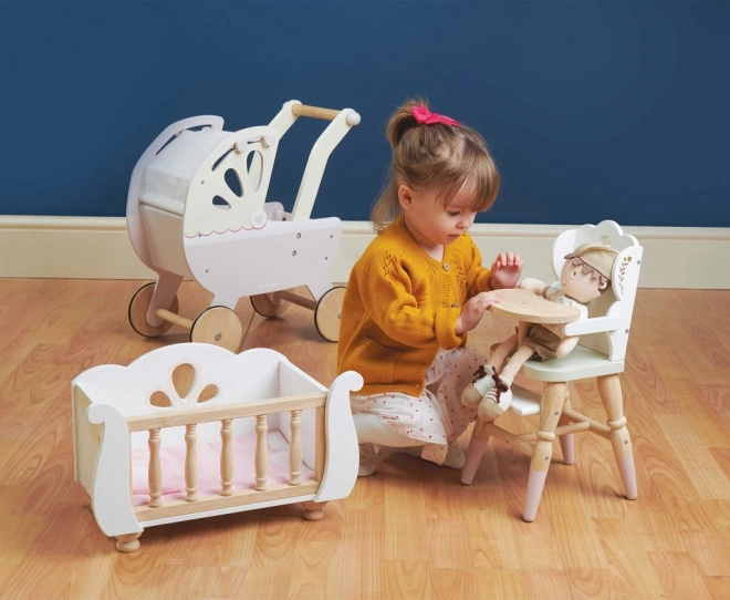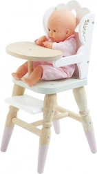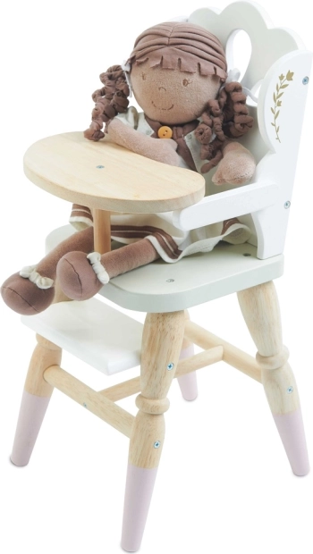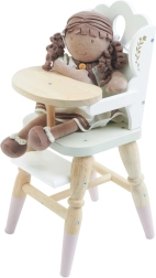 Lesena otroška jedilna stolčka za punčke ponuja idealno možnost, kako razviti otroško domišljijo in jih vključiti v igre vlog. Zaradi svojega stilskega dizajna z okrasnimi detajli in kakovostno izdelavo zagotavlja realistično izkušnjo. Stolčka je primerna za plišaste igrače in lutke do velikosti 35 cm ter odlično dopolnjuje druge dodatke iz kolekcije Honeybake, kot so posteljica Sleigh in voziček Sweet Dreams.