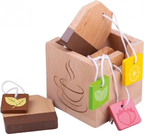 Komplet lesenih čajnih vrečk je idealen dodatek za otroško kuhinjico ali trgovinico. Stilizirane vrečke s priljubljenimi okusi spodbujajo ustvarjalno igro ter učijo otroke bontona in postrežbe.