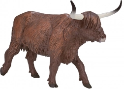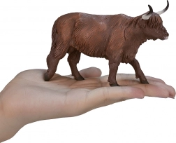 Podroben plastični model škotskega višavskega bika z dolgo teksturo dlake in izrazitimi rogovi.