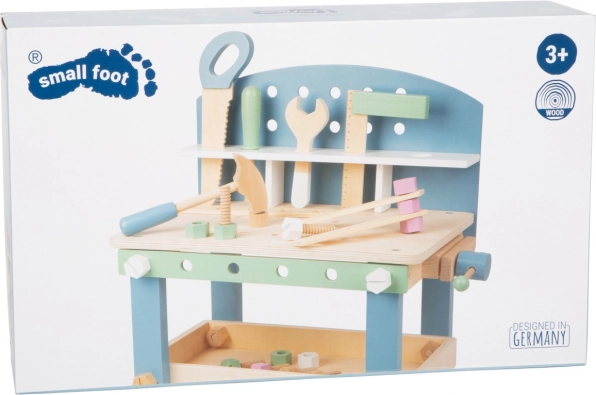 V kompletu je 21 delov: 5 vijakov, 5 matic, 3 žeblji, 5 kosov orodja in 3 perforirane ploščice za vadbo vijačenja in zabijanja. Ne manjkajo primež in spodnja polica za varno shranjevanje vseh dodatkov. Odlična izbira za dečke in deklice od 3 let dalje.