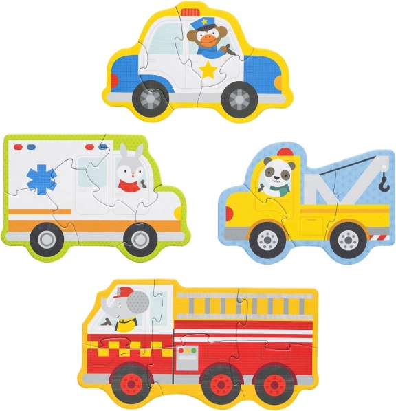 Simpatične ilustracije otrokom približajo svet reševalcev – zajec vozi reševalno vozilo, opica policijski avto, slon gasilski tovornjak, panda pa vlečno vozilo. Različna težavnost sestavljank (3, 4, 5 in 6 kosov) spodbuja postopen razvoj veščin, potrpežljivost in veselje ob uspehu.