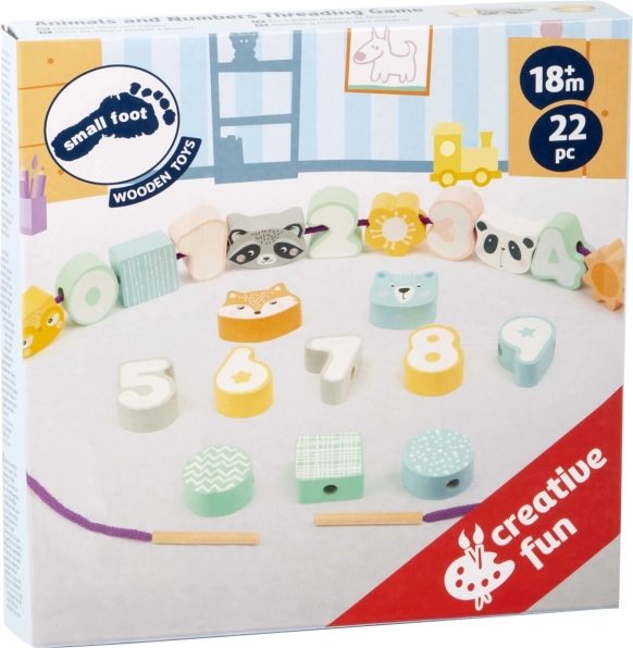 Ta kakovosten leseni komplet znamke SMALL FOOT otrokom prinaša veselje do odkrivanja števil in oblik. Pastelne barve in prijetne oblike vabijo k igri, medtem ko praktična vrvica z lesenim zaključkom pomaga malim prstkom zlahka nizati posamezne delčke. Komplet je idealen za prvo učenje števil 0–9 ter razvoj potrpežljivosti, zbranosti in logičnega mišljenja.