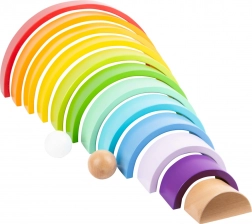 Ta velika lesena mavrica ponuja desetine načinov igre: od gradnje stolpov in mostov do ustvarjanja krogličnih stez in ravnotežnih izzivov. Otroci se naravno učijo barv, velikosti in razvrščanja, urijo koordinacijo oko–roka ter razvijajo logično mišljenje.
