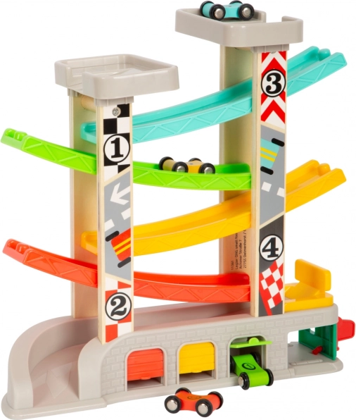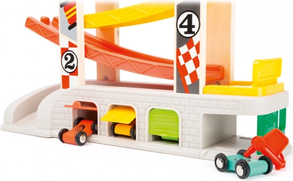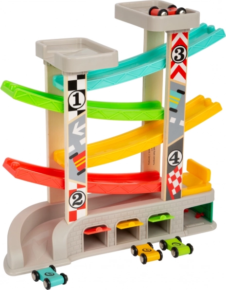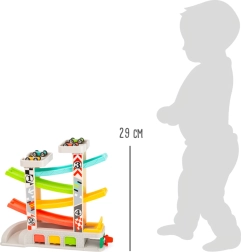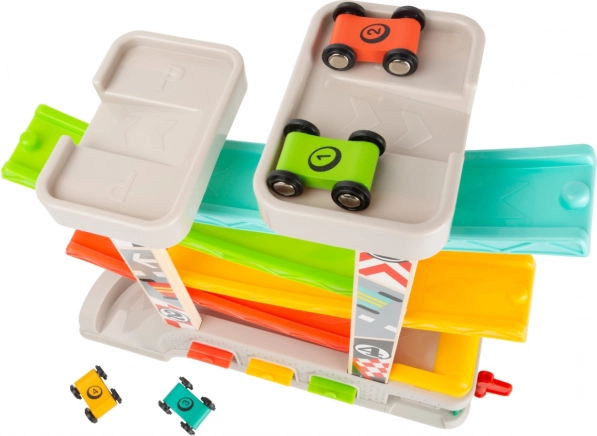 Steza je zasnovana za razvoj veščin posnemovalne igre in fine motorike, medtem ko se otroci dirkajo s štirimi raznobarvnimi avtomobilčki. Poleg tega lahko mali dirkači zahvaljujoč praktičnemu sistemu parkiranja in shranjevanja svoje avtomobilčke po dirki preprosto pospravijo.