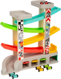 Dirkalna steza vsebuje različne nivoje in barvite avtomobilčke, kar zagotavlja zabavno in izobraževalno igro.