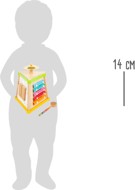 • Vsebuje 4 različne zvočne instrumente: ropotuljico, mini ksilofon, boben in majhen činela.
