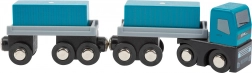 Modra ladja z barvnimi zabojniki in dva vlačilca, povezana z vrvico, prinašajo realistično igro morske plovbe.