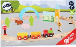 Set vsebuje 24 delov, vključno z magnetnim vlakcem z vagoni, zaskočenimi lesenimi tiri in barvnimi dekoracijami. Odporno leseno izvedbo je prijetno držati, je varno in idealno za male roke. Igra naravno razvija fino motoriko, ročno‑vidno koordinacijo in učenje pravil v prometu.