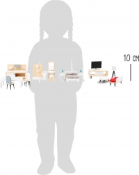 Stilska in brezčasna garnitura pohištva SMALL FOOT vsakšno hiško za punčke spremeni v prijeten dom. Kombinacija naravnega lesa in bele barve deluje čisto in moderno, detajli, kot so blazinice, lučke in ogledalo, pa igri dodajo pristnost. Deli so prilagojeni majhnim otroškim rokam ter se odlikujejo po trdnosti in vzdržljivosti.