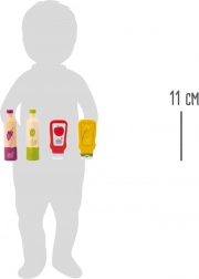 Vsaka steklenička ima izrazite ilustracije (olje, kis, kečap, gorčica), zahvaljujoč katerim otroci zlahka prepoznajo vsebino in jih vključijo v igro kuhanja.