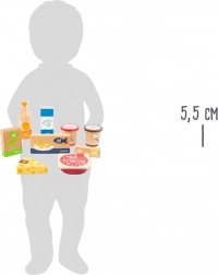 Set vsebuje pomarančni sok, dve embalaži sladoleda, embalažo graha, ribje palčke, maslo, sir, narezan salama in škatlo mleka. Realistični potiski in naraven videz navdušijo na prvi pogled. Zahvaljujoč trdnemu lesu je set trpežen in pripravljen za vsakodnevno igro.