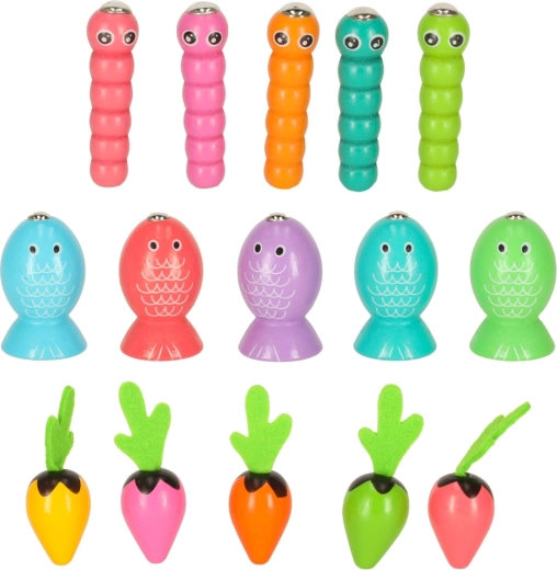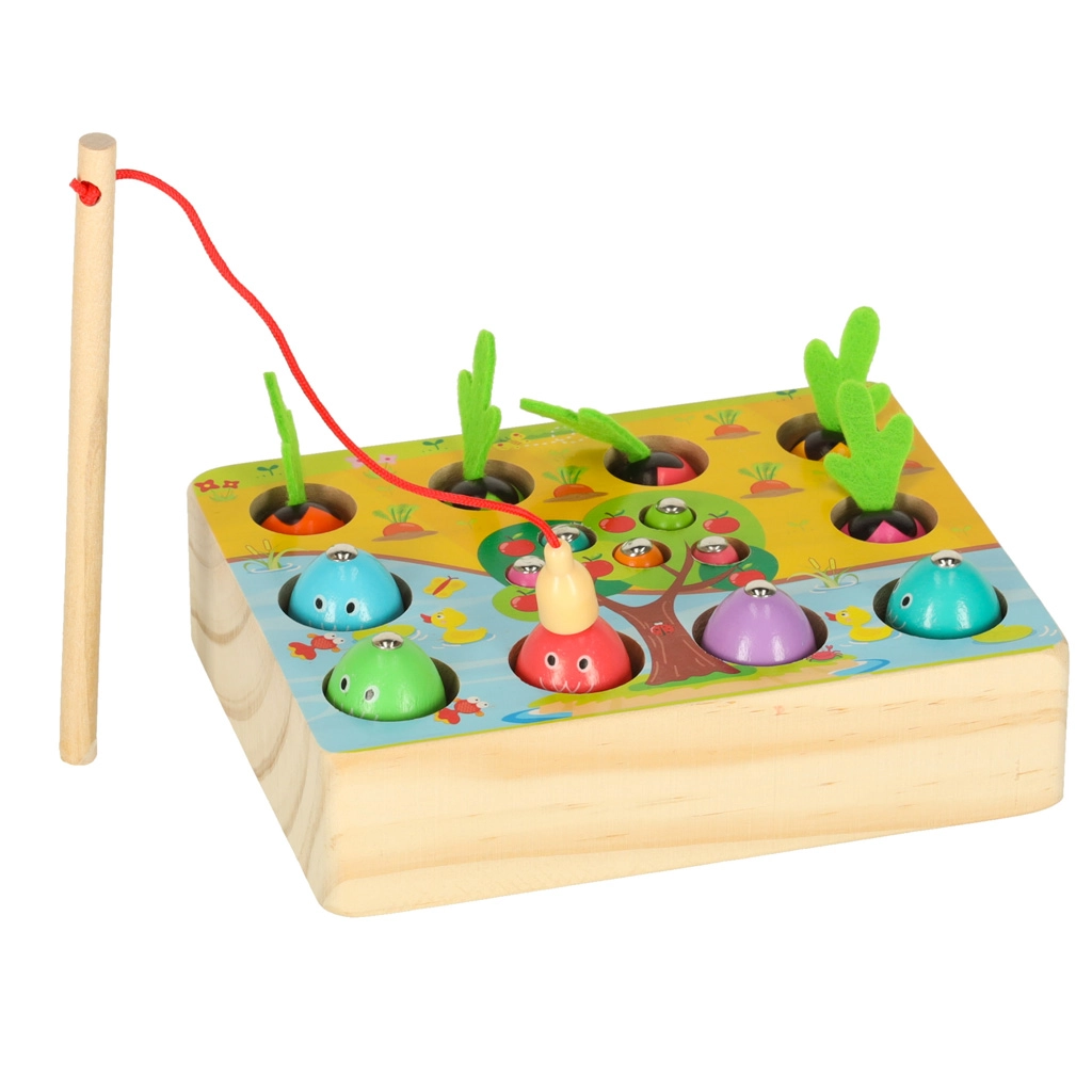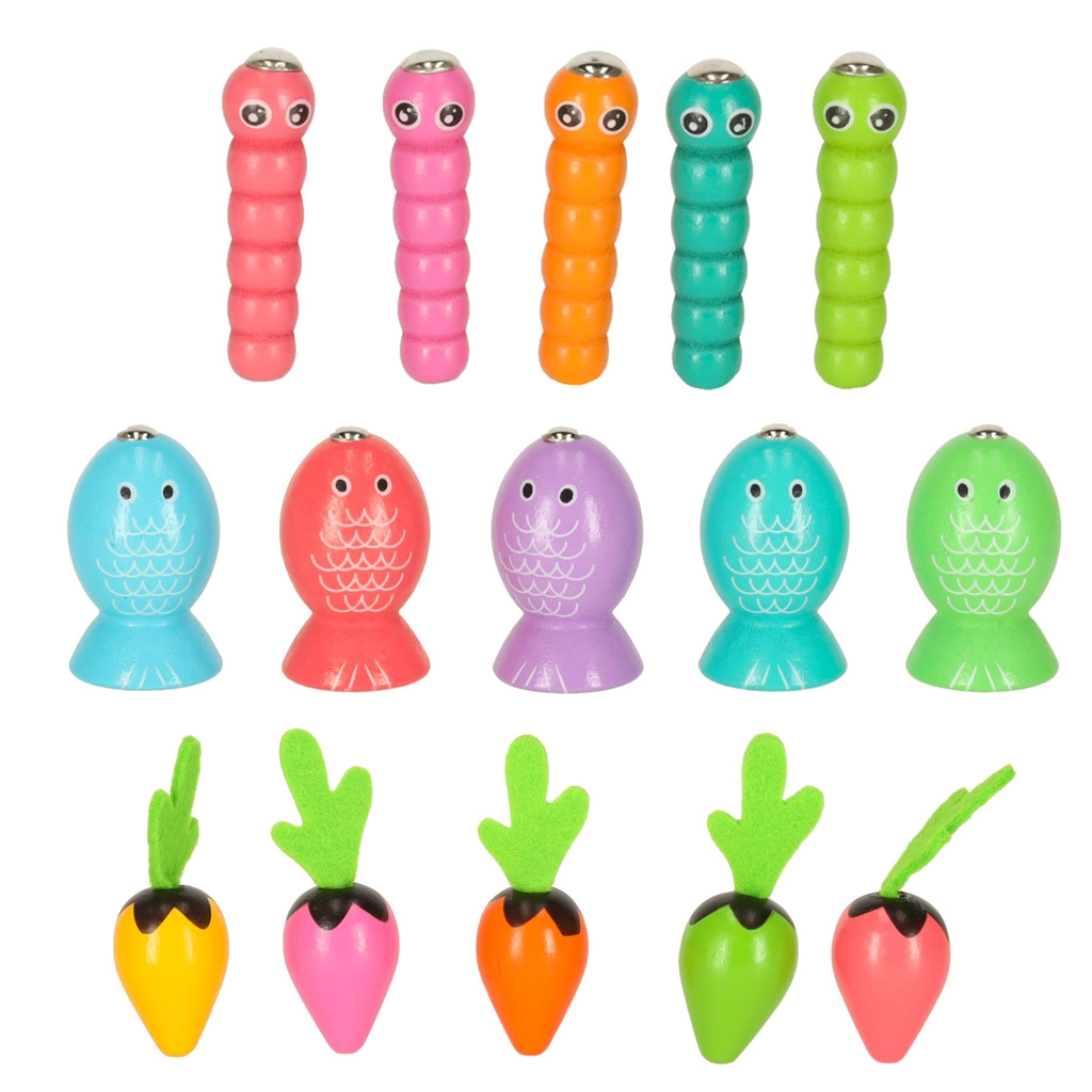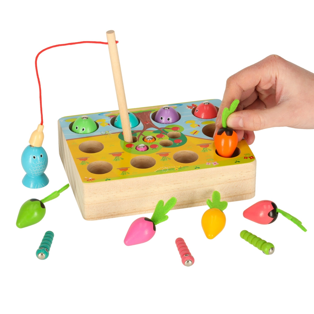 Ta večfunkcijski leseni komplet otroke popelje tako k ribniku kot na vrt – kar doma. Z magnetno palico bodo mali ribiči lovili ribice in črvičke iz pripravljenih odprtin, medtem ko male vrtnarje čaka pobiranje pisanih korenčkov za mehke filcaste lističe. Igra naravno razvija zbranost, natančnost gibov in uči otroke razlikovati barve.
