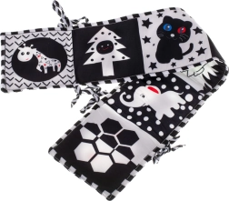 Kontrastna senzomotorična knjigica, zasnovana kot zaščita za posteljico, je popolna izbira za otroke, ki začenjajo odkrivati svet. Knjiga v obliki harmonike je lahko enostavno pritrjena na posteljico s pomočjo vrvic, kar prinaša ne le zabavo, ampak tudi varnost.