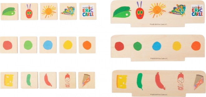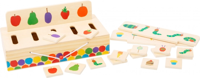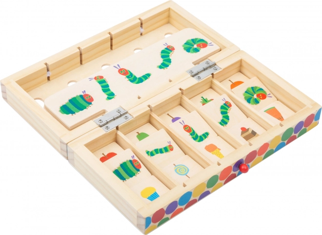 Dizajn s priljubljenim motivom Very Hungry Caterpillar otroke takoj pritegne. Ploščice in pokrov so enostavni za uporabo, trpežna lesena izdelava pa zagotavlja dolgo življenjsko dobo. Po igri vse preprosto zaprete z elastičnim trakom – nič se ne raztrese.