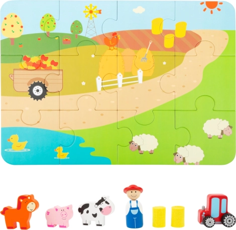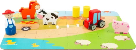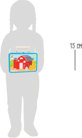 Pujsek kvika, traktor brni. Prenosna igra v čudovitem kovčku; otroci si lahko s pomočjo lesenih igralnih figuric v obliki traktorja, domačih živali in kmeta ustvarijo svojo lastno kmetijo. Najprej iz koščkov sestavite osnovo, nato se lahko začnete igrati! K popolnosti kmetije pripomorejo figurice bal sena. Potopite se v podeželsko življenje in pustite domišljiji prosto pot. Kovček je izdelan iz trpežne kovine, ročaj je lesen, ključavnico pa je mogoče preprosto odpreti. Primerno za otroške sobe, igralnice ... Glavne lastnosti: vsebuje 12 kosov puzzlov ter kmeta, traktor, pujseka, kravico, konjička in bale sena; praktična embalaža – kovinski kovček z lesenim ročajem