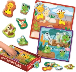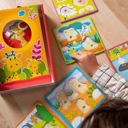 Odkrijte igrivo didaktično zbirko, v kateri otroci zlagajo mladiče k njihovi mami in očetu, spoznavajo živali in njihovo naravno okolje ter pri tem urijo potrpežljivost, pozornost in fino motoriko. Komplet je zasnovan za najmlajše – preprosti obrisni koščki dobro sedejo v roko in jih je lahko vstavljati.
