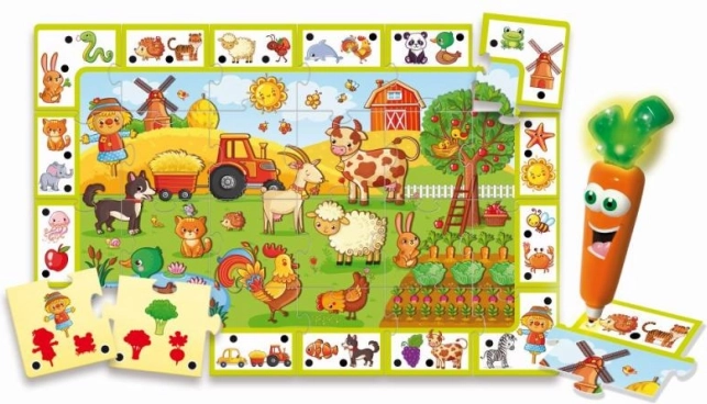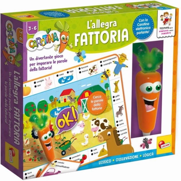 CAROTINA podjetja LISCIANI prinaša zabavno in poučno igranje na temo podeželja. Otroci sestavljajo sliko iz dvostranskih koščkov in s pomočjo govorečega svinčnika – korenčka – odgovarjajo na preprosta kvizna vprašanja. Interaktivni pristop motivira k raziskovanju in učenju skozi igro.