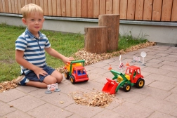 Vključuje aktivno figurico. Otroci lahko odprejo kabino, posadijo voznika in si izmišljajo nove zgodbe ter naloge na gradbi.