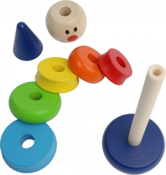 Zaradi različnih velikosti obročev otroci urijo fino motoriko, logično razmišljanje in potrpežljivost. Žive barve podpirajo vizualno zaznavanje ter učenje barv in zaporedja. Lesena izvedba zagotavlja vzdržljivost in varno igro.