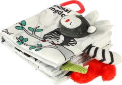S to mehko knjižico v kontrastnih barvah se bo vaš malček podal v odkrivanje sveta živalic – od sove, opičke in pande do rakuna, slona, krokodila ali zebre. Črno-beli in rdeči elementi podpirajo zgodnjo vizualno stimulacijo, medtem ko različne teksture in interaktivni elementi razvijajo fino motoriko ter koordinacijo oko–roka. Vsaka stran vsebuje angleška imena živali, kar naravno podpira tudi prvo besedišče.