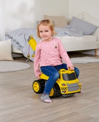 Za udobno vodenje skrbita dva praktična ročaja na kabini, medtem ko sprednja in zadnja zaščita proti prevrnitvi povečujeta varnost pri vožnji. Kovinske osi in mehke pnevmatike, ki ne puščajo sledi, zagotavljajo gladko vožnjo po notranjih tleh in na prostem na igrišču ali na vrtu.