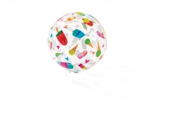 Prosojno žogo krasijo barviti potiski sadja, sladoledov, ribic in morskih motivov. Motiv je izbran naključno, vendar vedno zagotavlja vesel videz in dobro vidnost v vodi in na plaži.