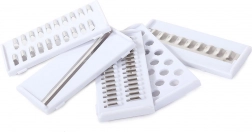 Varnost pri delu zagotavljata držalo za živila in zaščitni pokrovi rezil za varno shranjevanje. Vse dele je mogoče pomivati v pomivalnem stroju do 60 °C, kar prihrani čas in trud. Set vsebuje 7 zamenljivih nastavkov za maksimalno vsestranskost ter koš – odcejevalnik za hitro izpiranje.
