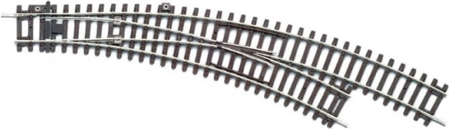 Podroben železniški Piko kretnik s posnetkom lesenih pragov v realističnih barvah in kombinacijo dveh 30° krivin (R4/R3) za usmerjanje v desno. Ročno upravljanje z možnostjo priklopa daljinsko vodene naprave.