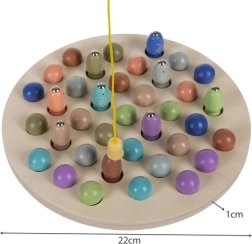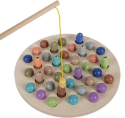 Ta lesena magnetna igra lovljenja ribic je odlična izbira za razvoj otroških veščin. Otroci lovijo barvite ribice z magnetno palico, razvrščajo kroglice ter vadijo rokovanje s ščipalkami in paličicami. Spodbuja logično razmišljanje, spomin in spretnost ter hkrati prinaša veliko veselja.
