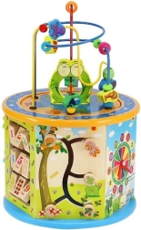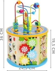 Zgornji del s koralnim labirintom je odličen za vadbo prijema in fine motorike, stranske plošče pa ponujajo vstavljanko oblik, zobnike, računalo, številke, labirint in druge aktivnosti. Spodnja stran skriva namizno igro »Človek, ne jezi se« s figurami in kockami v pakiranju – idealno za skupno družinsko zabavo.