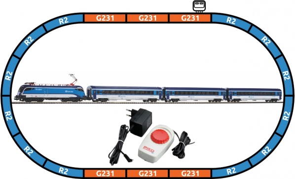 - Vsebina kompleta: električna lokomotiva ČD Taurus (1×), potniški vagon 2. razreda ČD (3×), loki R2 s podlago (12×), ravne tirnice G231 s podlago (5× + 1× z napajalnim priključkom), napajalna sponka s podlago, osnovni analogni upravljalnik z napajalnikom.