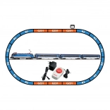 V kompletu so lokomotiva, trije vagoni, popoln oval tirnic in analogni upravljalnik – po sestavi lahko vozite takoj. Priporočena minimalna konstrukcijska površina je 168 × 98 cm.
