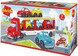 Atraktiven Abrick transporter za prevoz avtomobilčkov! Transporter je opremljen s sklopno rampo, ki omogoča enostavno nakladanje in razkladanje šestih barvnih avtomobilčkov.