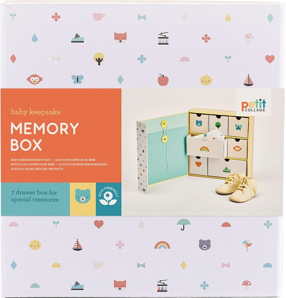 Slogovno in trajnostno shranite prve zaklade svojega dojenčka. Ta dizajnerska škatla spominov znamke Petit Collage ponuja 7 predalčkov in praktičen žep za drobnarije, kot so prvi komplet oblačil, pramen las ali zapestnica iz porodnišnice. Izdelana je iz recikliranega papirja in brez plastike v embalaži, zato je idealna izbira za ozaveščene starše in kot izvirno darilo ob rojstvu otroka.