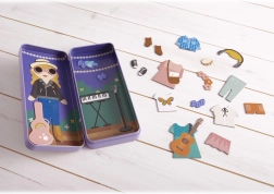 Priročna kovinska škatlica služi kot shranjevalnik in scena ter omogoča udobno igranje doma in na poti. Dve različni ozadji podpirata raznolike scenarije ter razvijata otroško domišljijo, potrpežljivost in fino motoriko.