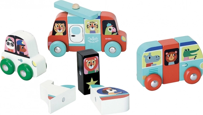Odkrijte kreativni set Vilac za najmlajše: lesene magnetne sestavljanke, iz katerih lahko sestavite do štiri različna vozila – avtobus, helikopter, osebni in policijski avto. Deli se lahko poljubno kombinirajo, zato otroci razvijajo domišljijo in fino motoriko. Ilustracije švedske umetnice Ingele P. Arrhenius dajejo igrački edinstven retro slog. Primerno od 2 let, vsebuje 12 koščkov iz kakovostnega lesa z varnimi magneti.