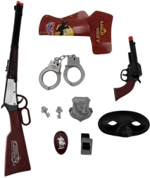Spremenite otroško sobo v prerije Divjega zahoda. Ta igralni komplet za male kavboje ponuja vse potrebno za pustolovske prizore – od “šerifovih” lisic do “kolta”, ki dopolni tako kostum kot domišljijo. Lahki in enostavni dodatki so prilagojeni otroškim rokam.