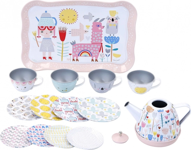 Skodelice, krožnički, desertni krožniki, pladenj in čajnik so iz kovine – lahki, a trpežni za vsakodnevno igro.