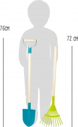 Lopata meri 76 cm, grablje 72 cm. Velikost je prilagojena otroškim rokam za varno in veselo delo na vrtu.