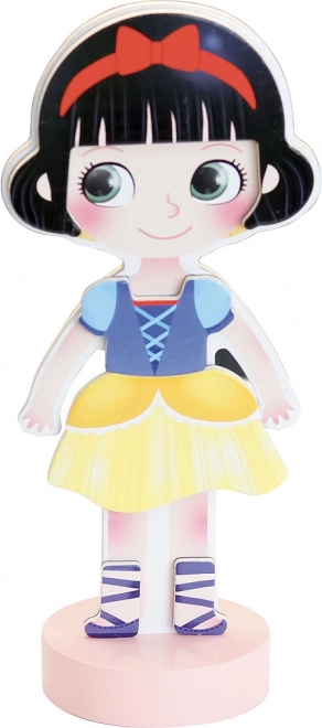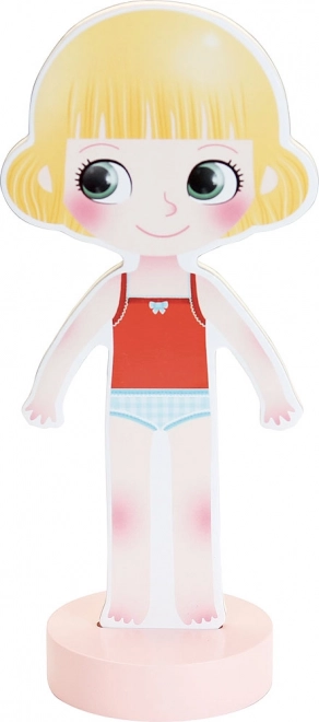 - 1 lesena figurica na podstavku, 36 magnetnih kosov oblačil in dodatkov