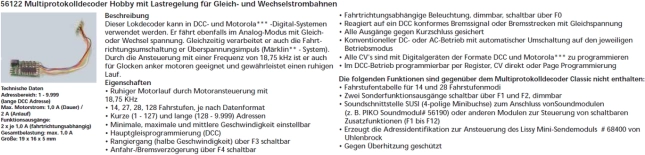 Zmogljiv večprotokolni dekoder Piko Loco je idealen za modele železnic, saj zagotavlja nemoteno delovanje zaradi združljivosti s sistemi DCC in Motorola. Ta dekoder lahko deluje tudi v analognem načinu z enosmerno napetostjo in podpira spremembo smeri vožnje s prenapetostnimi impulzi sistema Märklin.