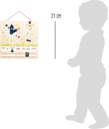 Večnamenska izobraževalna tabla združuje uro s premičnimi kazalci, koledar z dnevi, meseci in datumom ter pregled vremena in letnih časov. Otroci tako na naraven način urijo orientacijo v času in načrtovanje, hkrati pa pri premikanju in nastavljanju posameznih elementov vadijo fino motoriko.
