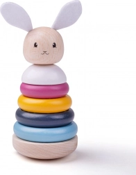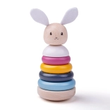 Ta kakovostna lesena zložljivka v pastelnih barvah je idealna prva izobraževalna igrača. Otroci zlagajo obročke od največjega do najmanjšega, krepijo koordinacijo oko–roka ter se učijo razlikovati barve in oblike. Tekstilni ušeski in repek zajčka dodajajo tipno razsežnost igre.